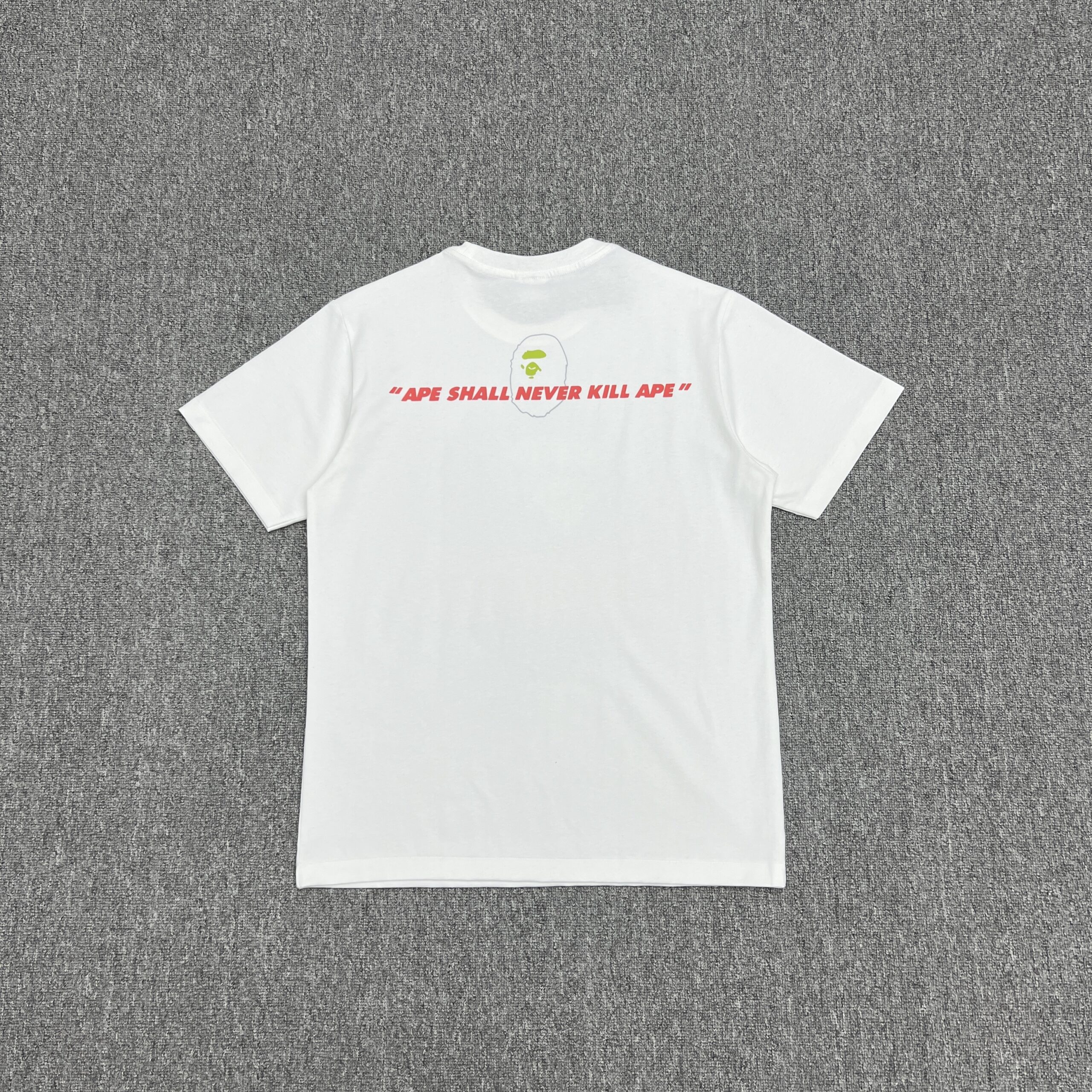 Turn the street into your personal runway with the tee that speaks unity and turns heads. The mantra that defined BAPE’s ethos—“Ape Shall Never Kill Ape”—is screen-punched across the chest in blaze-orange, high-density ink that literally rises off the fabric for a 3-D, graffiti-style pop. Set against a washed-black mid-weight Japanese cotton blank, the color clash is so loud you can almost hear it.