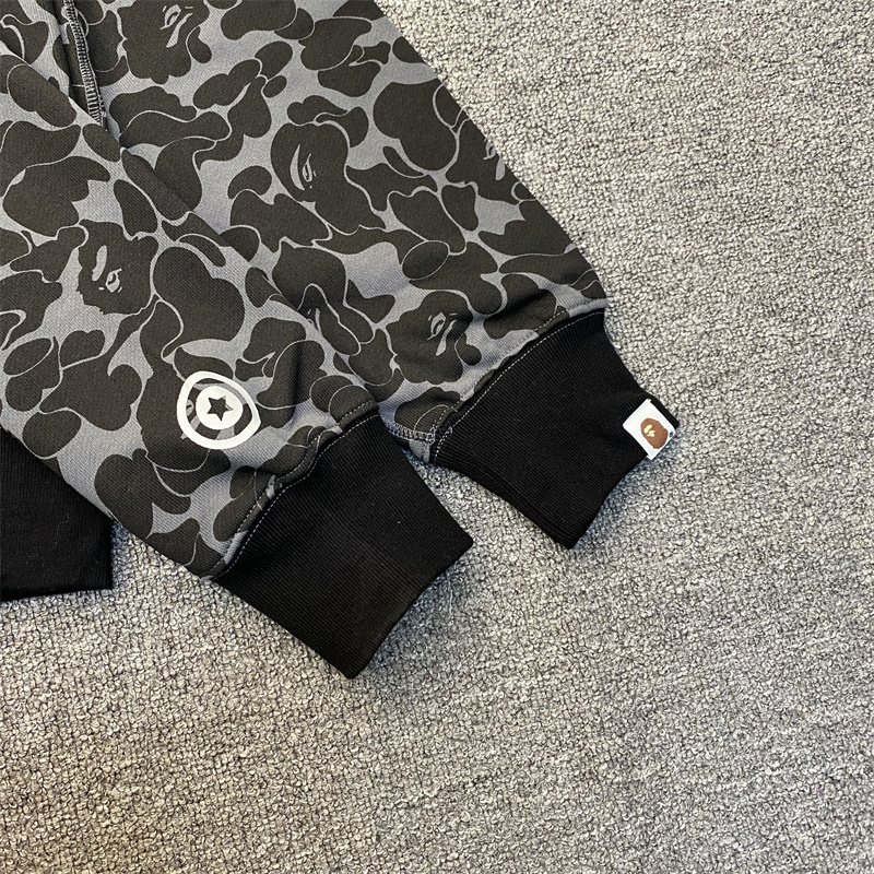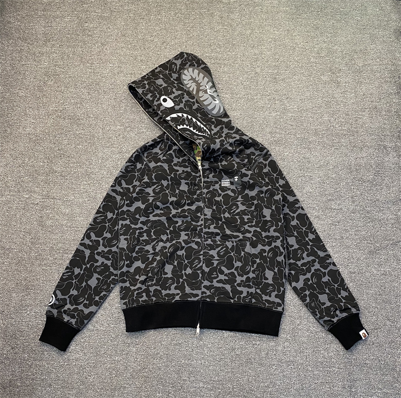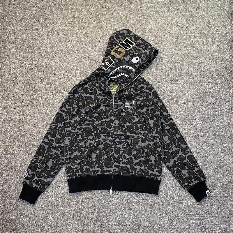 Zip up a piece of counter-culture history. For their 15-year partnership, BAPE cut the iconic Shark Hoodie in an all-black ABC Camo that only reveals its leaf-shaped shadows under direct light—an anti-flash flex engineered for the concrete jungle that is Dover Street Market. The usual kaleidoscope is muted to charcoal-on-black, so the shark teeth, eyes and WGM appliqué float like ghosts across the hood.