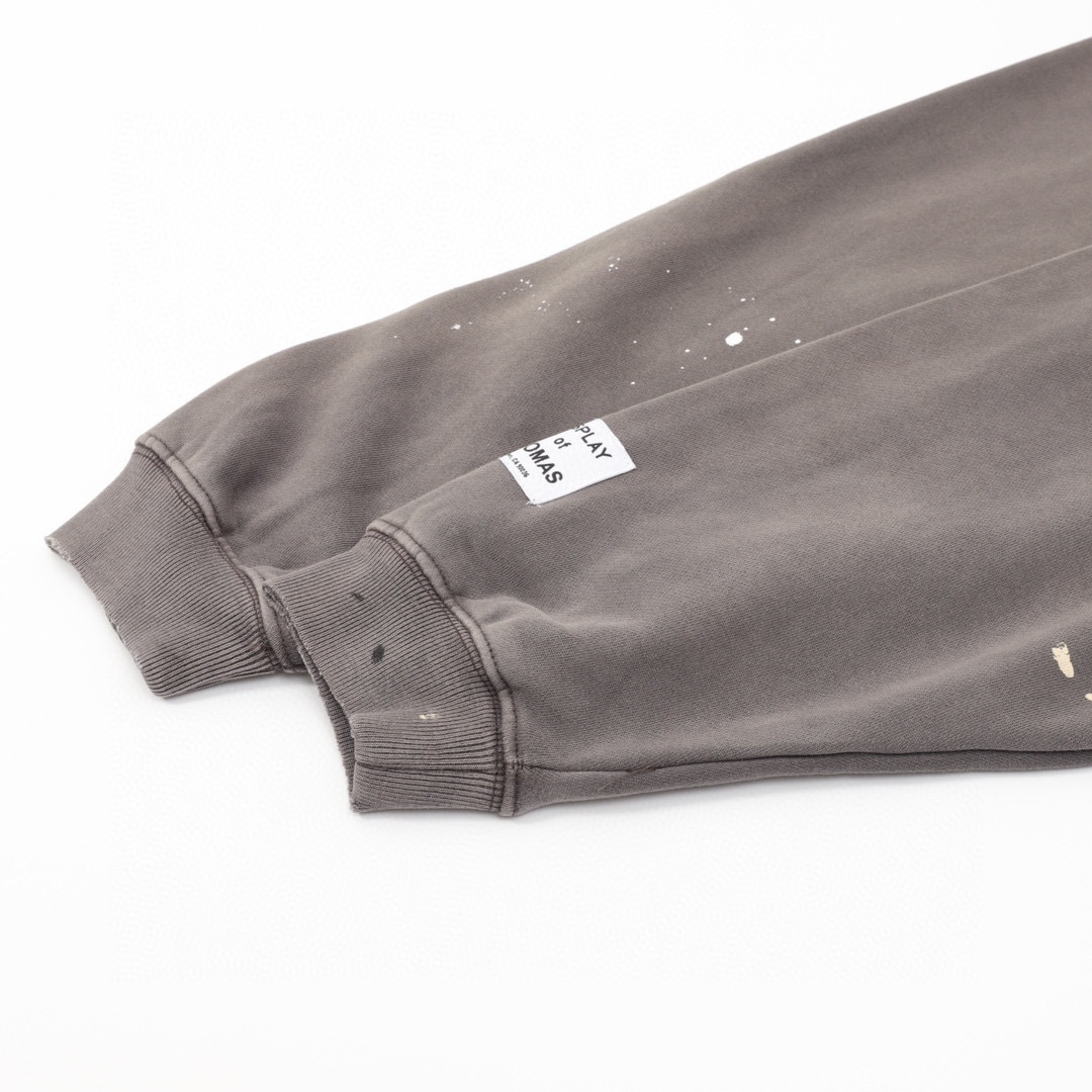 Fabric: Heavy-weight cotton fleece, garment-washed and enzyme-tumbled so the washed-black base already carries sun-bleached streaks and a buttery hand-feel.