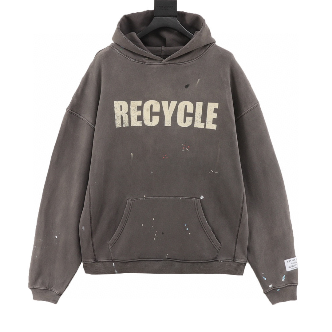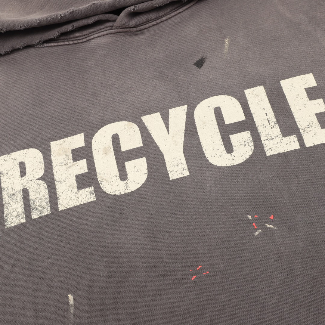Graphics: Front “RECYCLE” block-letter graphic plus paint-splatter accents – screen-printed in cracked off-white so the letters keep splitting with every laundry cycle for a one-of-one vintage look.