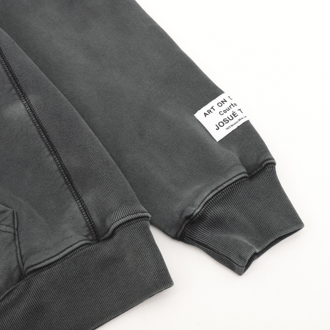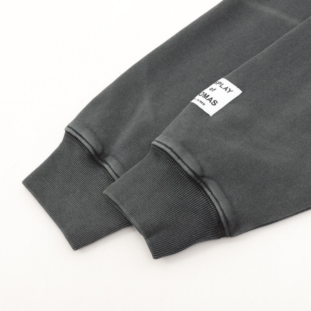 Fabric: Heavy-weight 100 % cotton fleece, garment-washed and enzyme-tumbled so the black base fades to charcoal around seams and pocket edges straight out of the factory.