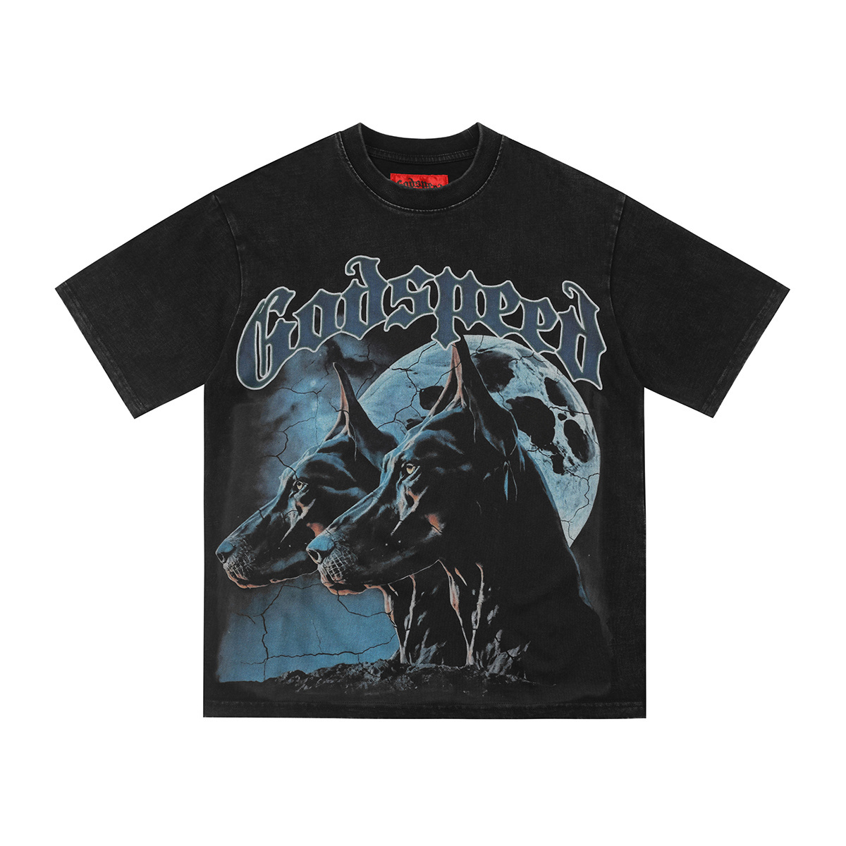 Godspeed Graphic T-shirt Featuring Two Dobermans Against a Full Moon