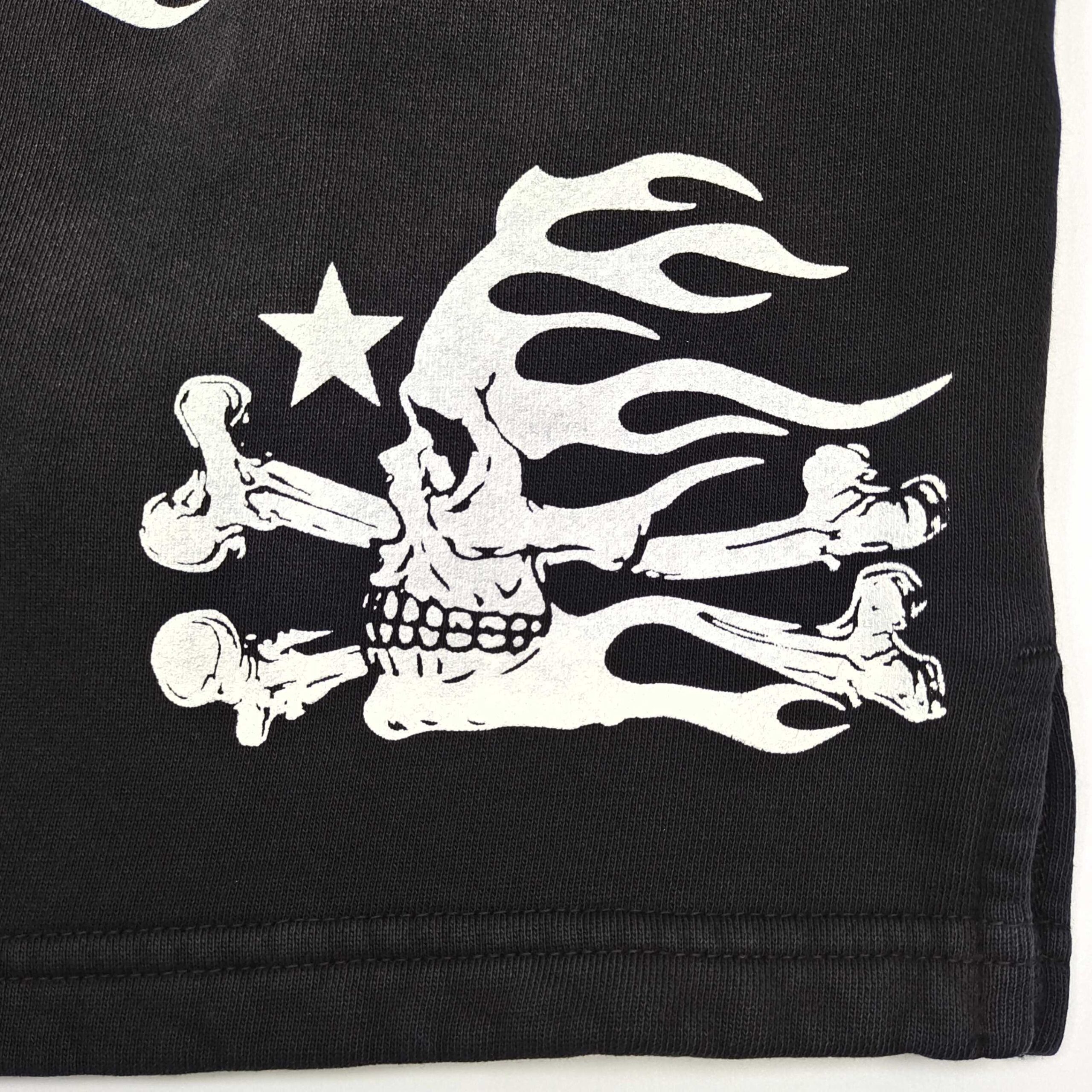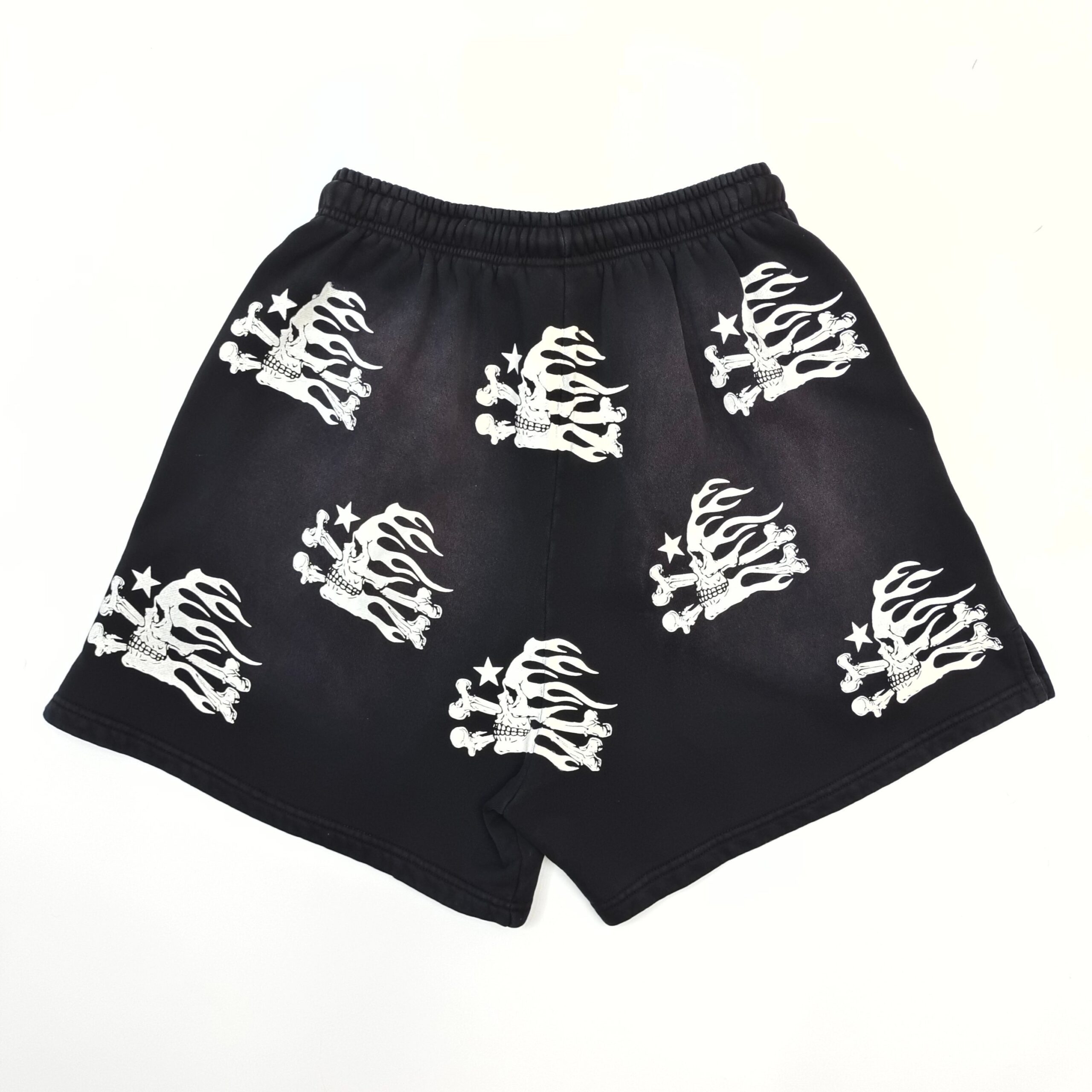 Graphics: Screen-printed skull motif repeated across the entire short – high-contrast white ink that crackles after the first wash for an instant thrift-store vibe.