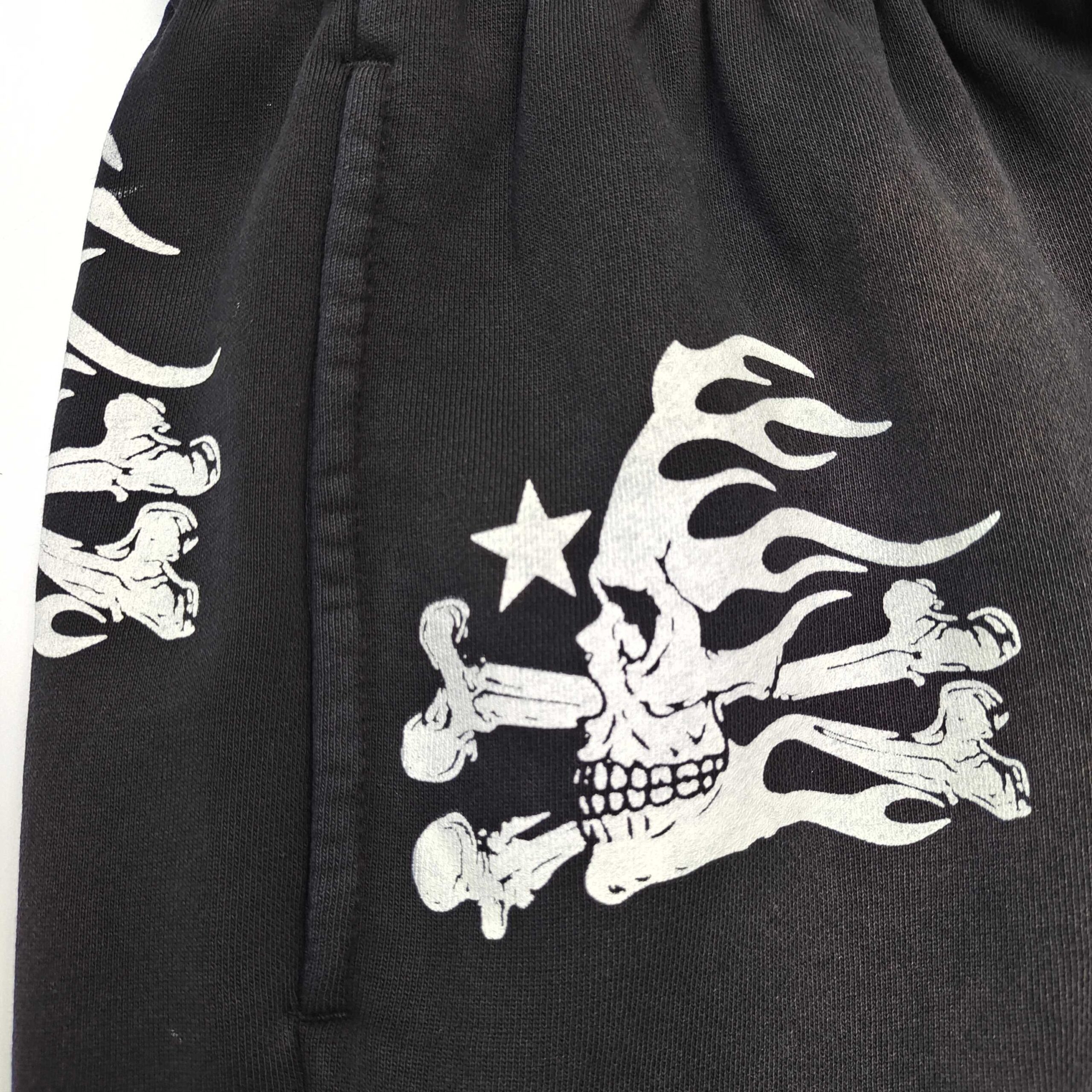 Hardware: Deep front slash pockets + single back patch pocket; draw-cord tips branded with tiny Hellstar crosses.