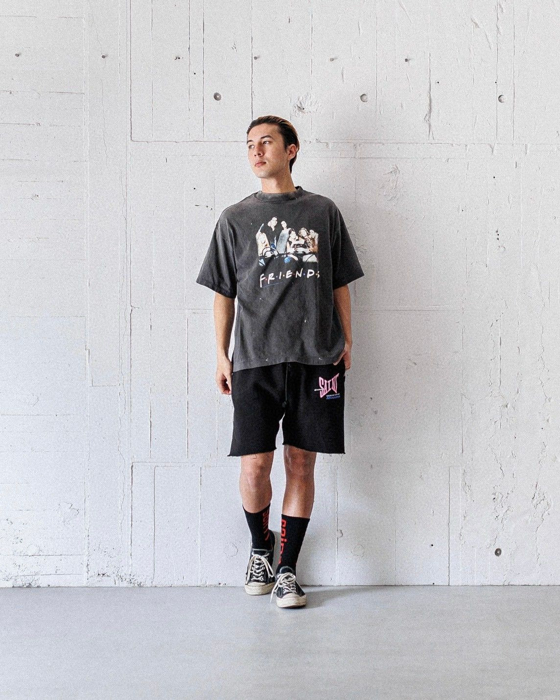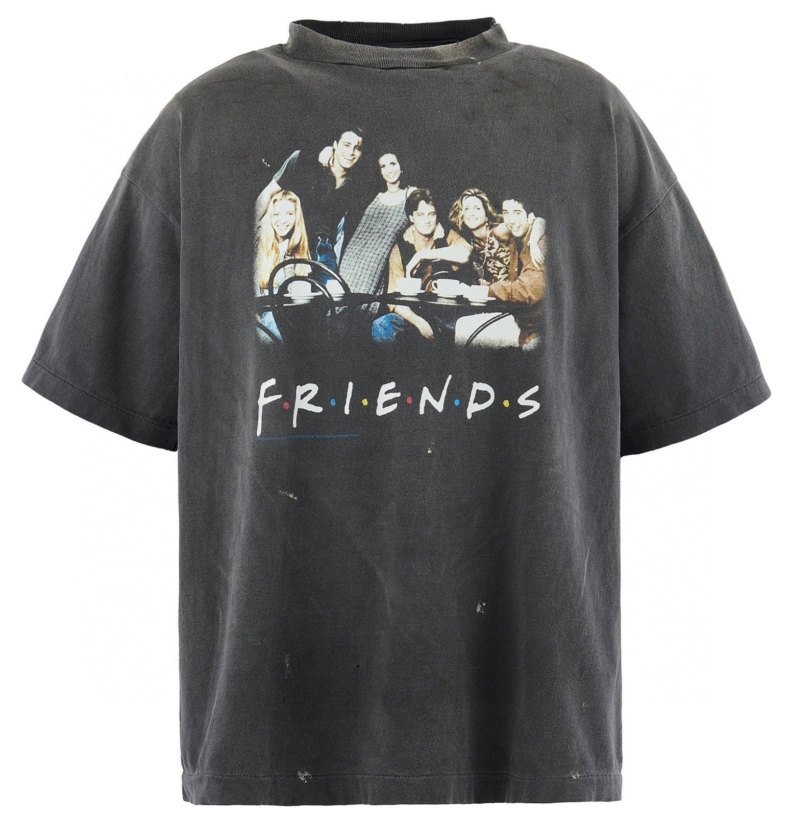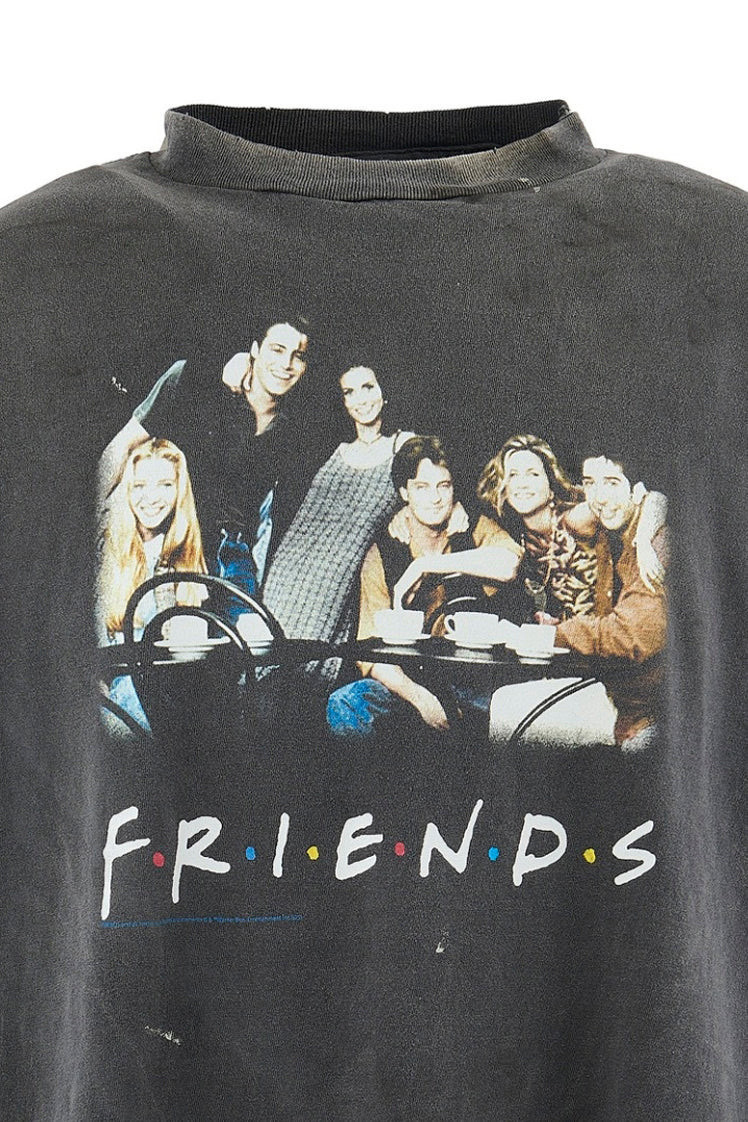 A boxy, mid-weight cotton-jersey blank that’s been stone-washed, enzyme-tumbled and hand-sanded so every shirt already feels like a 90s thrift find. The front carries a faded “FRIENDS” heart-and-banner graphic—the classic NYC sit-com logo—printed in crack-ink that splits more with every laundry cycle, while the back keeps it minimal with a tonal cross-patch chain-stitched in metallic silver thread .