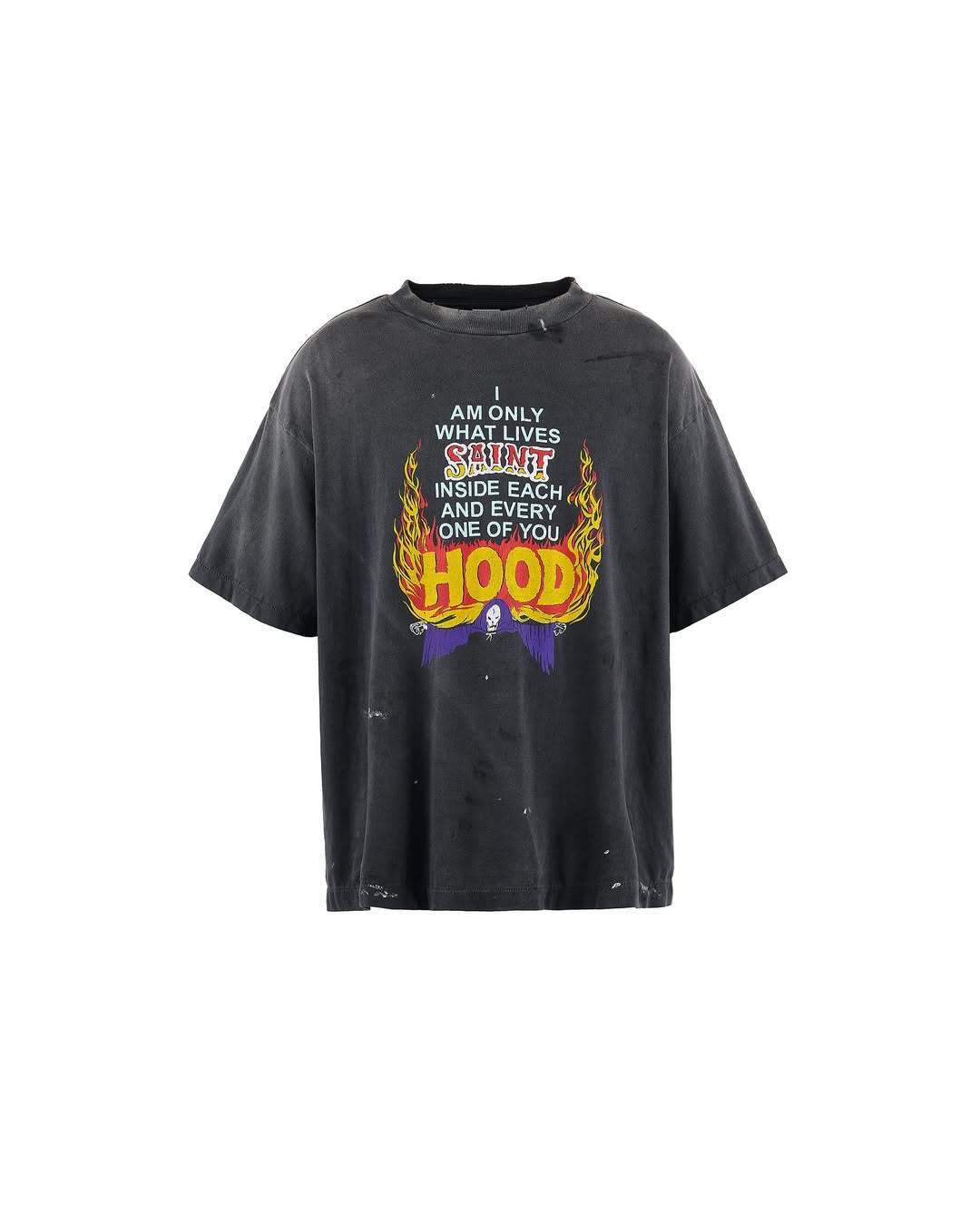 Cotton-Jersey T-Shirt – washed-black blank, front “STHD FLAME” graphic in cracked orange/yellow speed-burn print that keeps splitting with every laundry cycle for a one-of-one vintage look