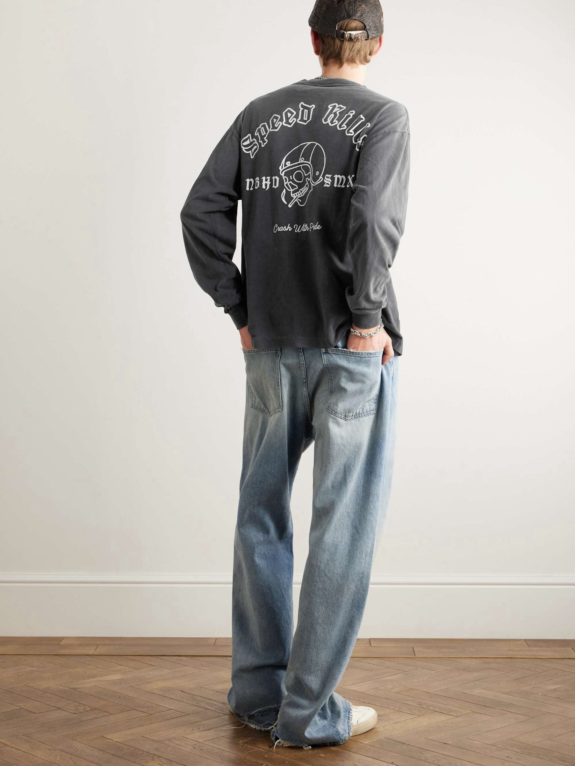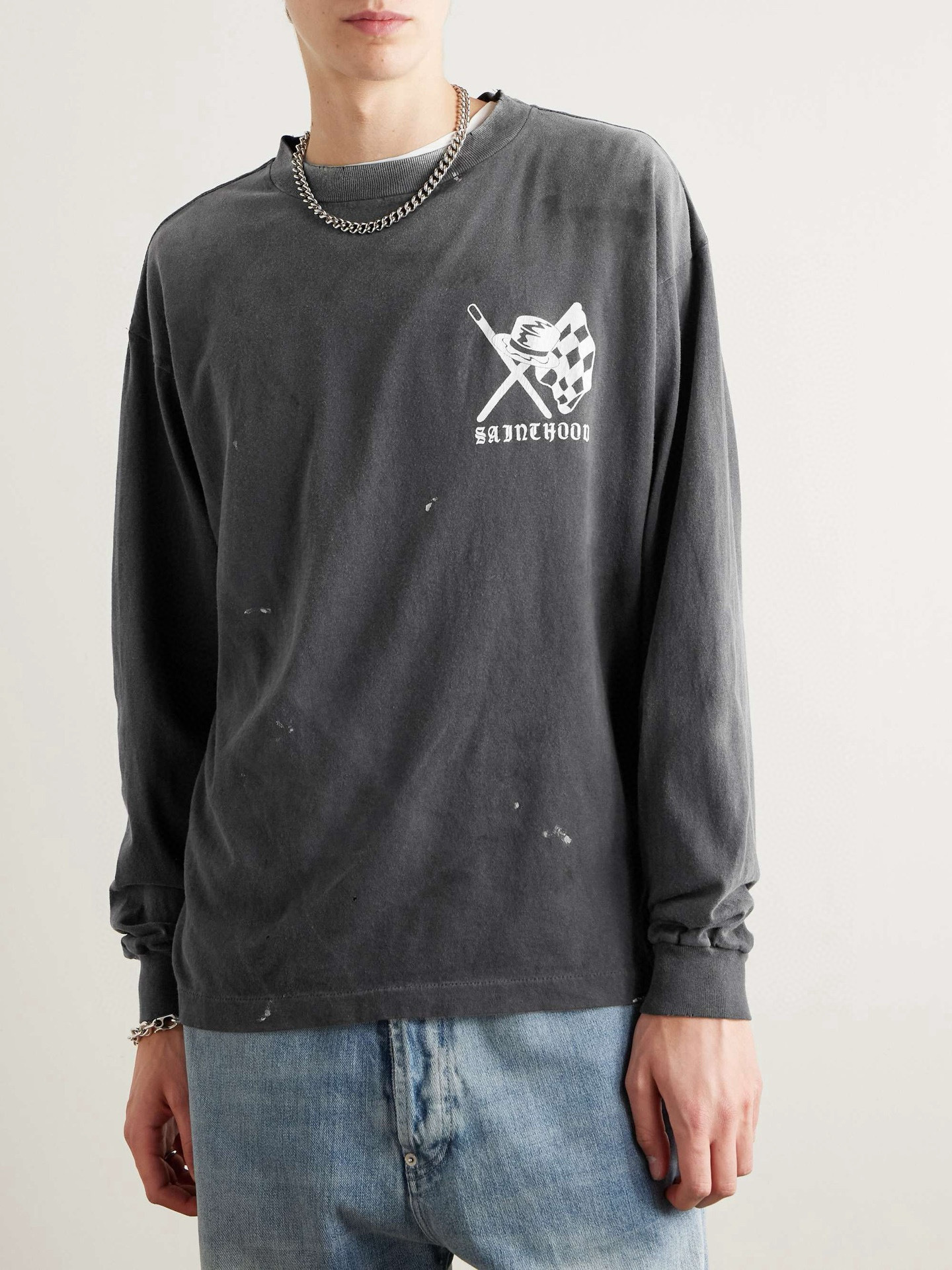 Sleeves: left arm carries Neighborhood’s “STHD” block logo; right arm gets a faded checkered-flag stripe that breaks at the seam for a shredded effect.