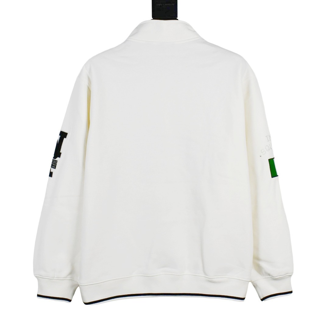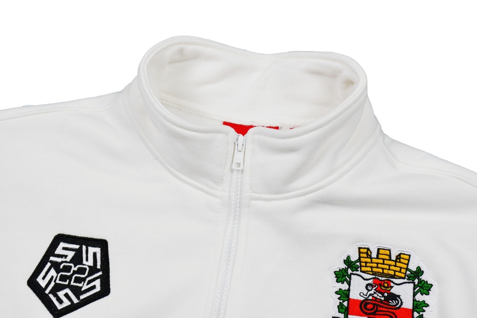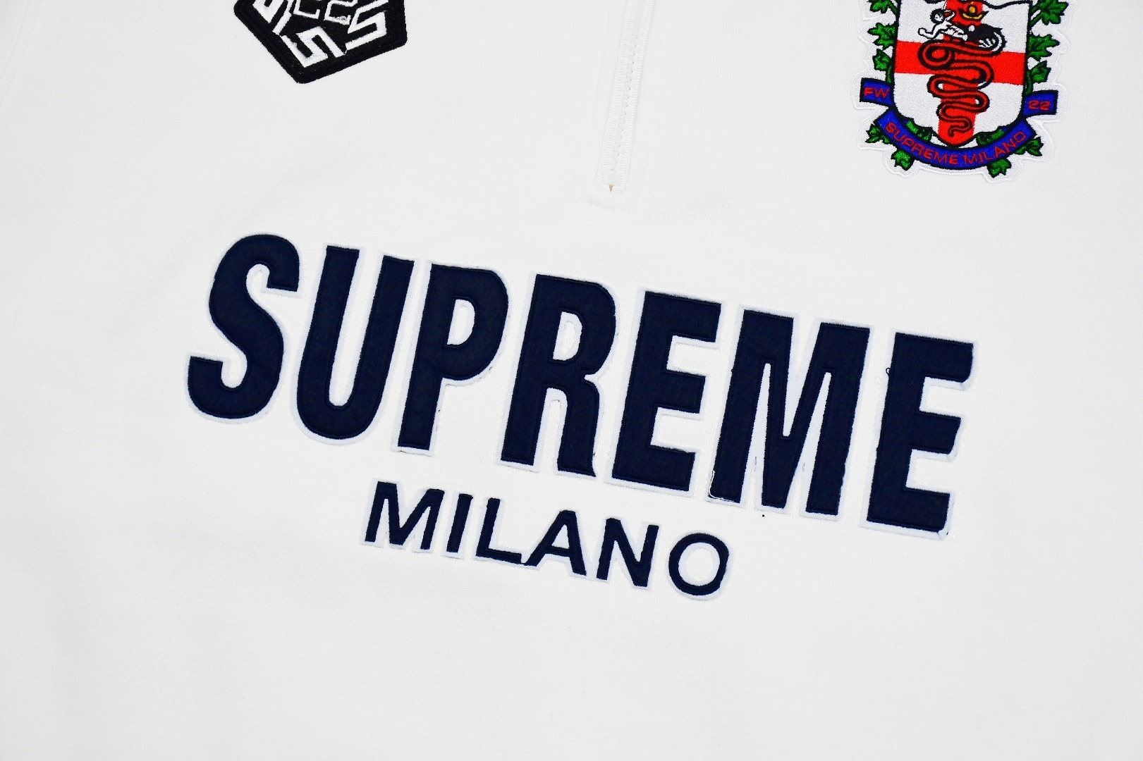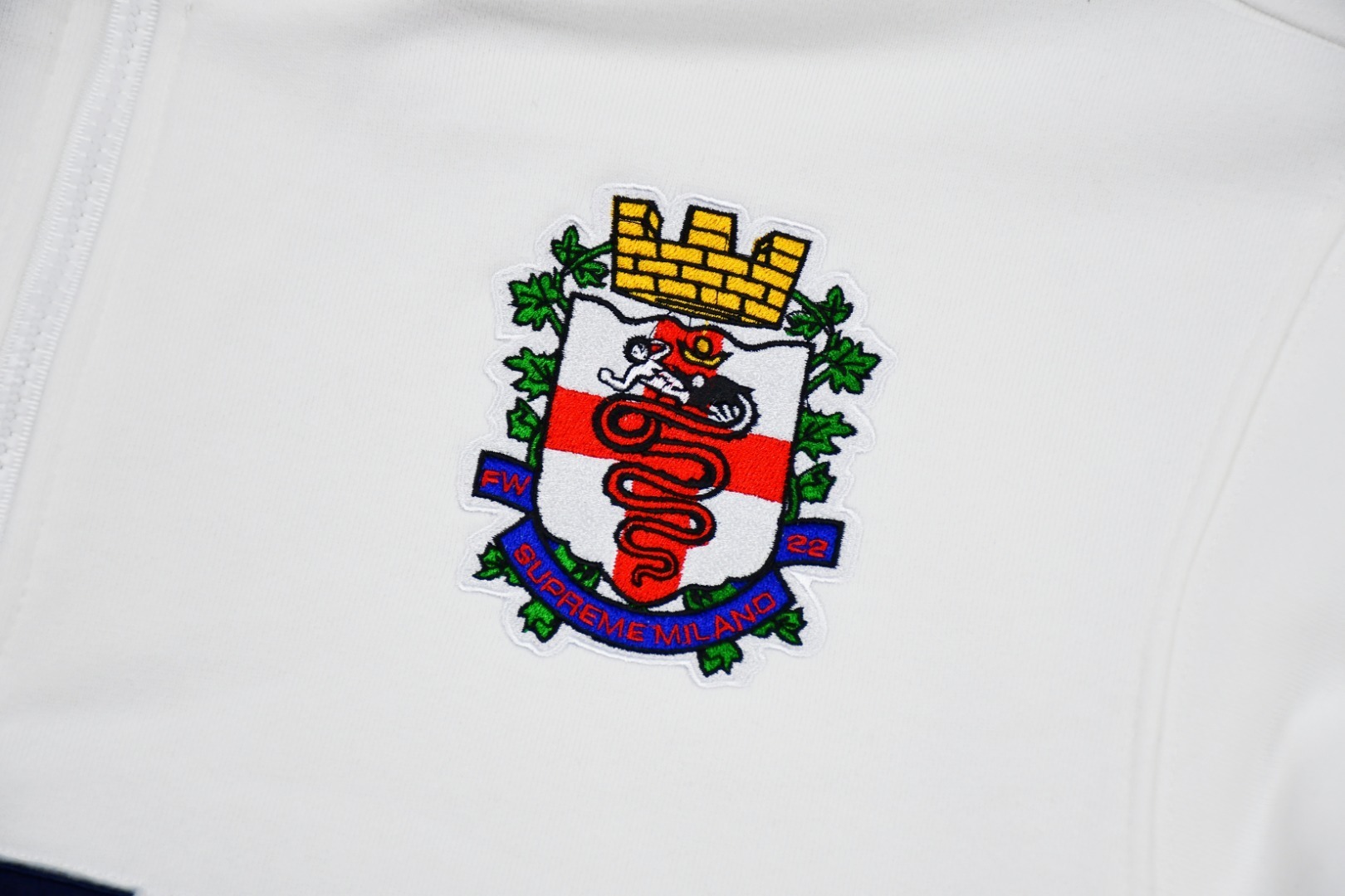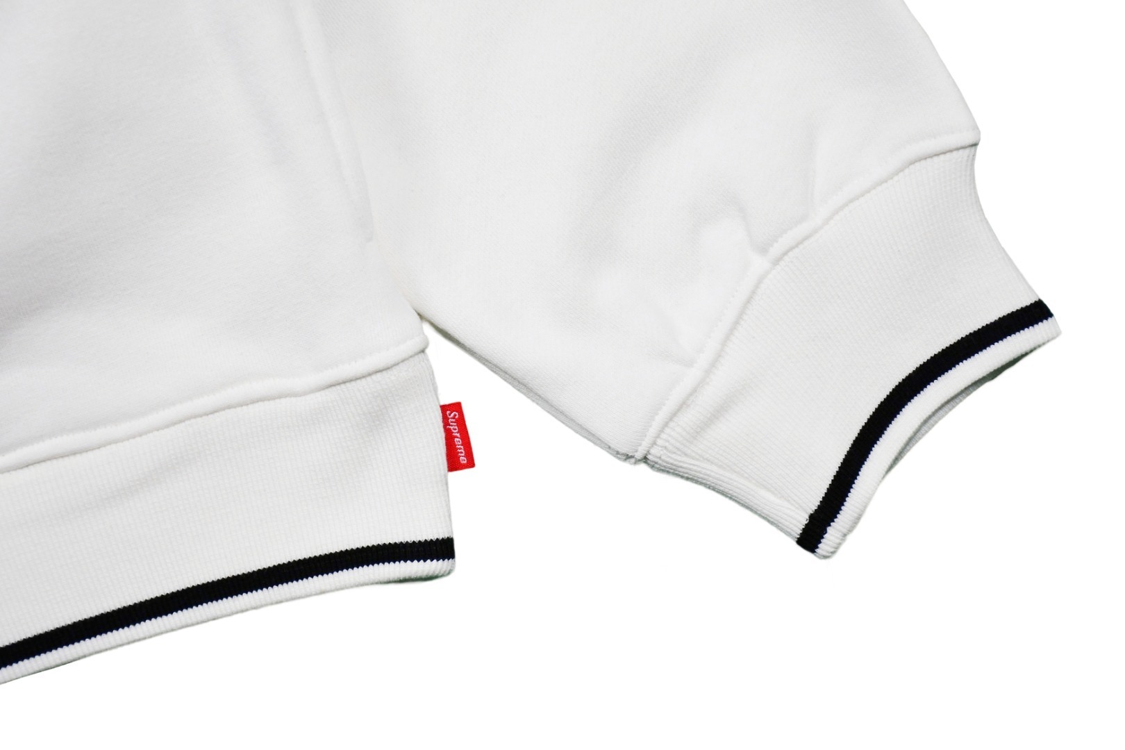 Colour-way: White body with tonal contrast stitching; small Supreme box-logo embroidery at left chest; chunky half-zip stand-collar for retro tennis vibes
